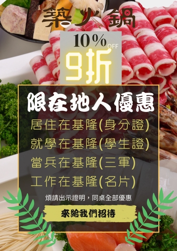 想知道基隆哪裡可以吃到新鮮又平價的海鮮鍋物? 一定要推薦給您在地人大推的 築火鍋!嚴選新鮮食材(包含菜盤都不馬虎),堅持不使用重組肉,連湯頭也很講究。海鮮控請直接點痛風鍋,一次滿足鮮蝦、小卷、蚵仔、蛤蠣、扇貝、大干貝...(舌頭一驚:這才是鮮甜的海味!)而以前總聽說基隆最優質的海鮮都直接運往外縣市...這實在太污辱身在海港的居民了!築火鍋還推出在地人優惠10% (出示證明) 但就算從台北來一趟,這樣的CP值也是不虛此行啊!吃飽喝足還可以去附近廟口走一走,體驗一下基隆的在地風情!